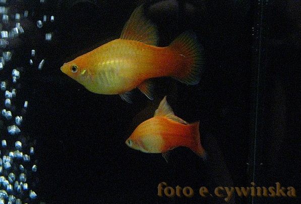 Кроме форм плавников меченосцы и пецилии имеют еще много признаков по которым ведется разведение и создание новых пород и линий , а так же относится рыба в ту или иную группу/породу/ , имеющих схожие признаки. Попробуем разобраться с фоновым цветом тела /не путать с рисунками которые могут присутствовать на разных фоновых/. Рисунки - это отдельная тема. Фоновые цвета тела - "ДИКИЙ" ГОМОЗИГОТНЫЙ/серый-пецилии , зеленый-мечи/ >>>> БЛЕДНО-КРАСНЫЙ/смешанная наследственность , красно-серый/ >>>> КРАСНЫЙ ГОМОЗИГОТНЫЙ >>>> ОРАНЖЕВЫЙ / смешанная наследственность , красно-желтый/ >>>> ЖЕЛТЫЙ ГОМОЗИГОТНЫЙ >>>> СВЕТЛО ЖЕЛТЫЙ /смешанная наследственность , желто-белый/ >>>> БЕЛЫЙ ГОМОЗИГОТНЫЙ. Дикий цвет доменирует над другими . Все - доминируют над белым. Оранжевые особи обычно окрашены одновременно и в желтый и в красный цвет и благодаря комбинации пигментов и фонового желтого получается оранжевый. Вариация "мэриголд"/цвет календулы/ - желтая фоновая с красным хвостовым стеблем и плавником. Лучше всего определять фоновую у молодых рыб.