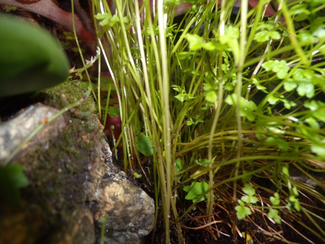 В крабятнике китайский мох из брикета пророс не сам, какой-то прикольный папоротник просеялся с ним . В террариуме 2 вида высаженных папоротников , держатся давно ,один вид даже размножается спорами,вылазя то тут то там, но условия замкнутого пространства поддушивают их все равно. А этот, третий , самосевный вид, буяет жизнью. Тонкий стебель заставляет поросль под действием тяжести развернувшихся листьев укладываться одну на другую, выглядит эстетично. Если обдать спреем, ляжет весь ,оставив неразвернувшиеся ростки , как копья. Прорежать легко - всегда много побегов, не жалко.