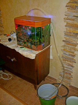 Сифонка под камнями еженедельно при подменах с помощью такой приспособы. По дну разложены шланги, вставленные потом в один большого диаметра, торчащий сзади. При уборке в него вставляется другой шланг. Реально- расход воды около 50 л/мин- тянет все. Выглядит сифонка так