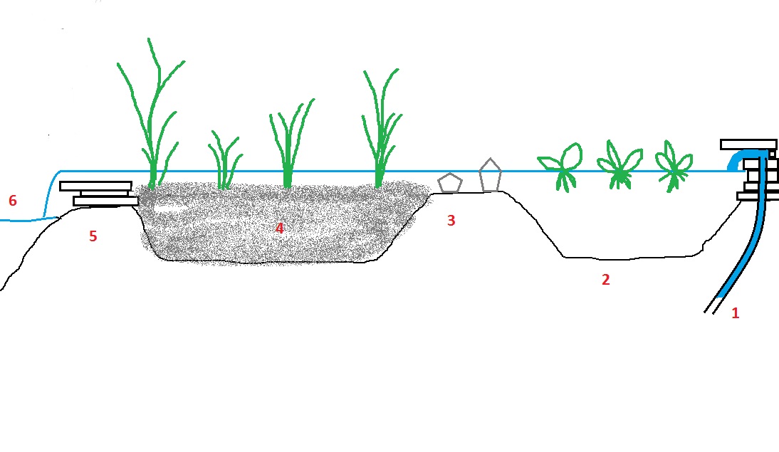 5- выход воды в водоем(регулируемый по уровню с помощью каменных плит)