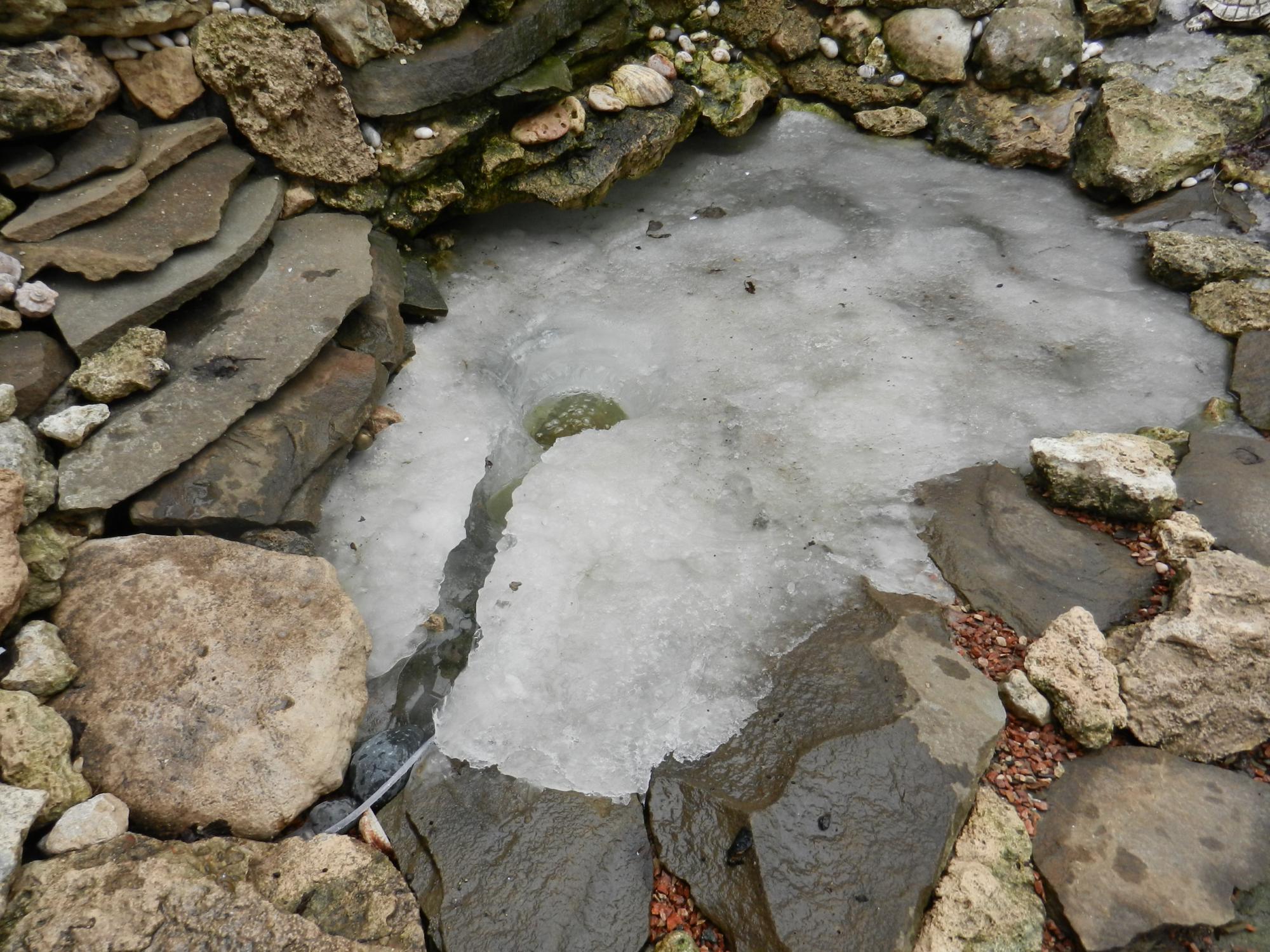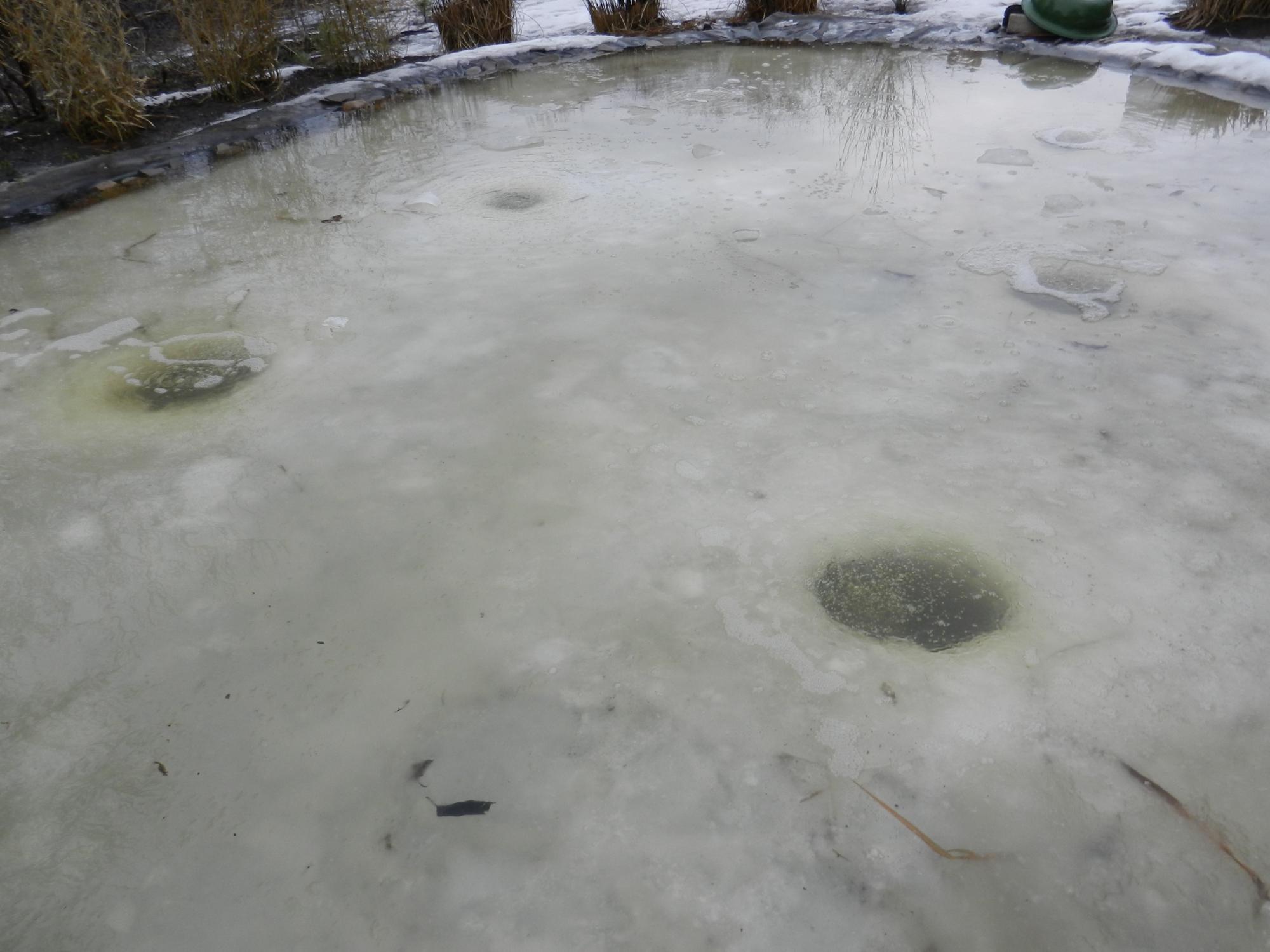 Аналогичные "образования" наблюдал в поза-позапрошлую (или поза-поза-поза) зиму (когда в Николаеве было, вроде, даже -26-27) на пруду 25кубов с зимовальной ямой 1,8м. Как назло, первый раз оставил на зимовку рыбу на улицу (десяток карпов и 16 или восемнадцать золотух годовалых), так что пришлось за них бороться.