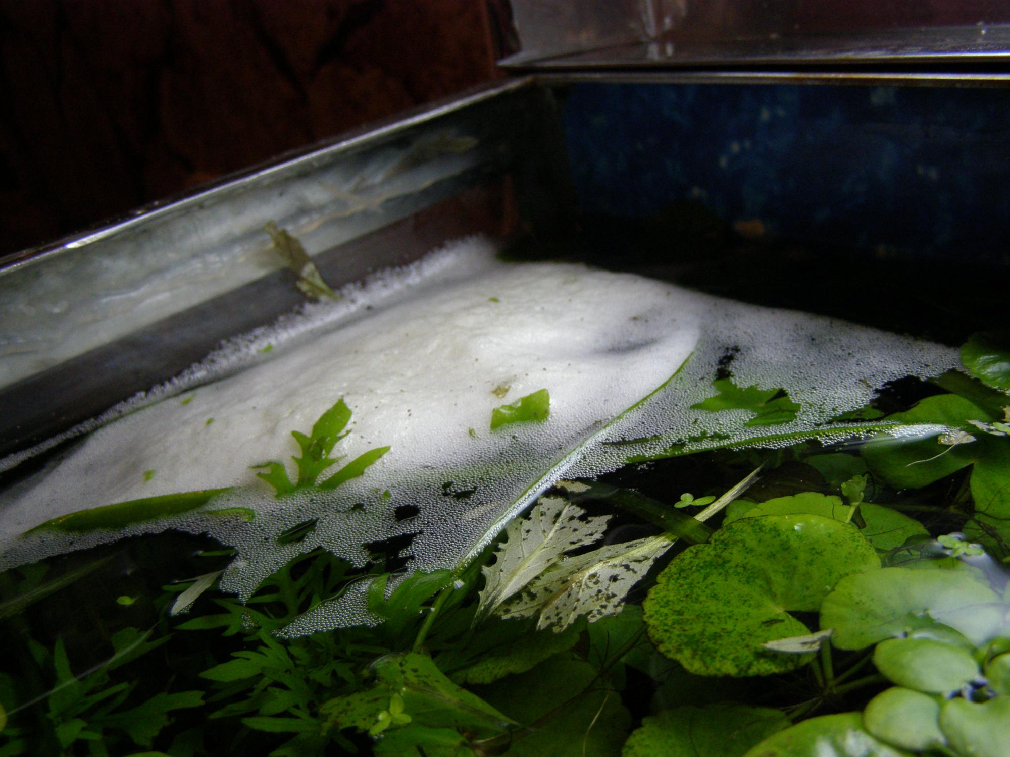 Доброго дня, помогите пожалуйста разобраться в ситуации. В последнее время в дальнем (от фильтра ) углу аквариума начала собираться какая то не понятная пенка, пятнышко размером дето с ладошку ( по площади ) и высотой ( пенного слоя ) дето с 1-2 мм - так было раньше ( на протяжении гдето месяца ). А вот сегодня обратил внимание, что площадь осталась прежней, а вот толщина пенки увеличилась гдето до 5 мм и стала какой то вроде бугристой. В акве живут гурами (самец и самка ), у меня живут уже 6 мес, брал в магазе, соко им тогда было - незн, мбожет мес - может пара. Попробую выложить фото пенки.