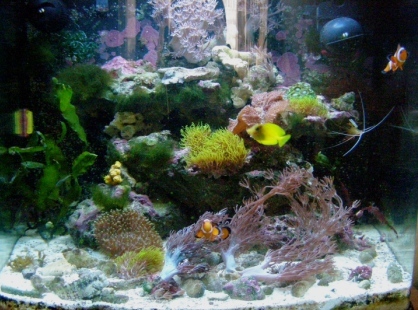 В аквариуме живут 2 оцеляриса, 3 трохуса, хирург, собака-водорослеед, рак отшельник, креветка доктор и вундермани, ксении, зоантусы, паразоантусы, 2 родактиса, рикордея, бриареум, тубастреи.