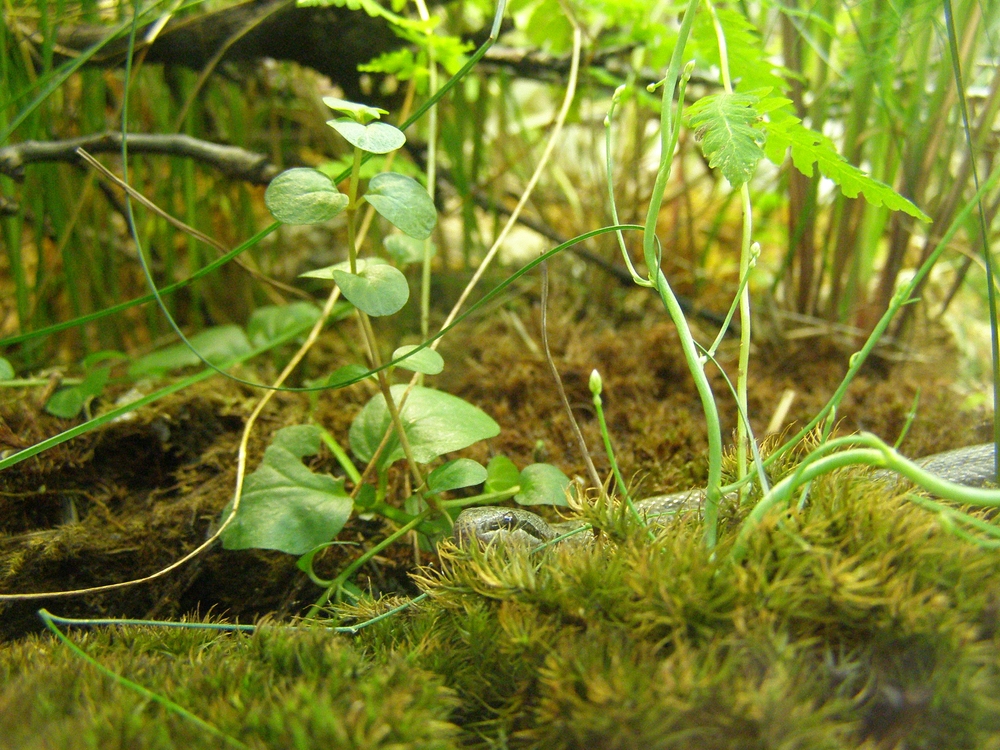 Она живет в террариуме с кучей амфибий, с муравьями, мокрицами и червяками всякими в земле, кучей растений, мхов и лишайников, воду пьет из 30 литровой поилки, где живут колюшки, щиповки и растет куча растений,
