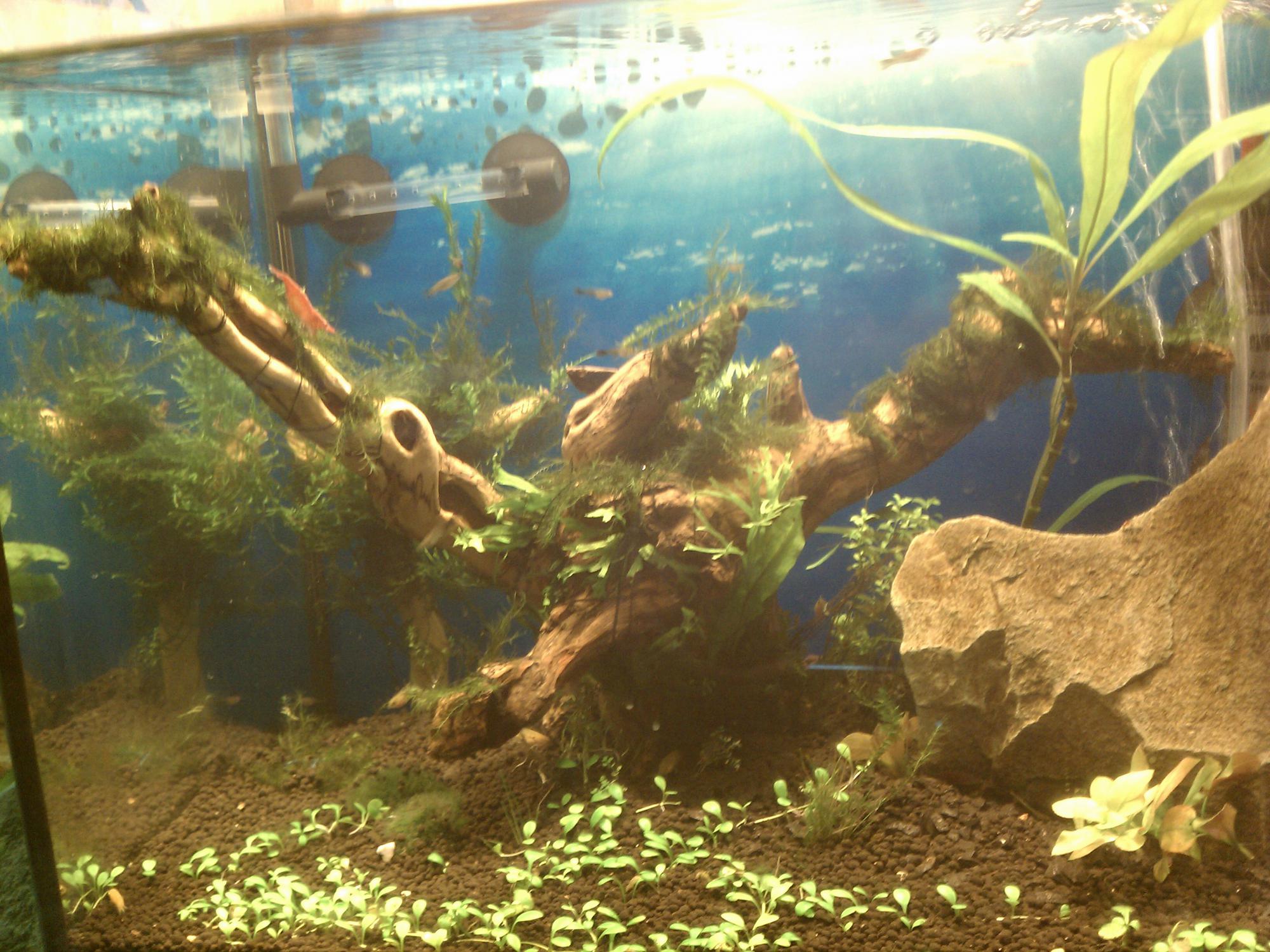 И я поместил его в общак прямо под лампы, на куст зеленой роталы (отражение в водной поверхности)