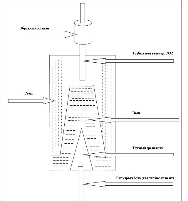 Обычная пластиковая труба для отопления. Внутри термоэлемент, который находится в воде, ну а остальное все понятно. Постоянная температура в системе за счет термоэлемента, вода дает равномерную передачу тепла на соду. Возможно использовать для водяного кожуха ребристую структуру, для лучшей передачи тепла (как в батарее).