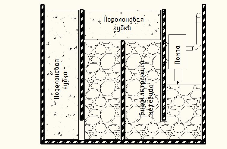 4. Между помпой и биофильтром необходимо разместить губку, что бы биоматериал не засасывало в помпу;