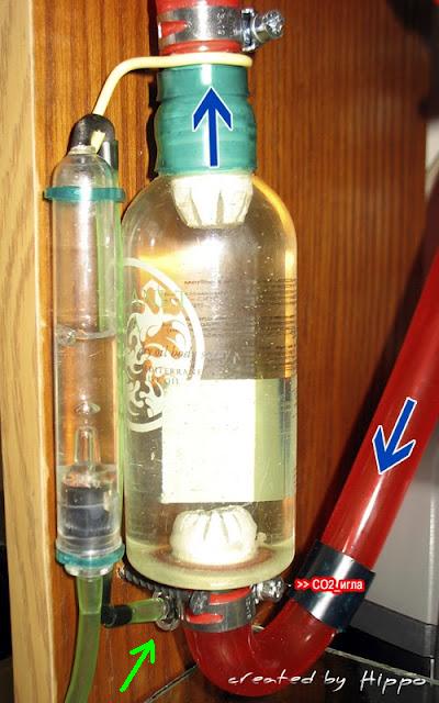 СО2 после счетчика бульбашок через иголку попадает в шланг, а затем через конфузор, который создает турбулентный поток в емкости. Причем, турбулентный поток такой, что бульбашки сразу разбивает в пыль (их даже не видно в емкости). Гидравлику процесса описывать не буду. В емкости всё это дело крутится-вертится и далее через диффузор попадает опять в шланг ... и через флейту в акву.