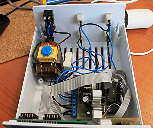 Блок управления разместился в подходящей пластмассовой коробочке (любезно подареной электроиком на работе) от импортного трехфазного автомата.