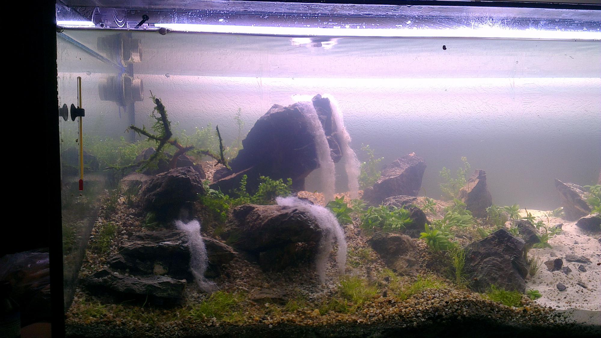 Вот и запустил аквариум.Готовность 80%.Теперь объясню как все должно быть.Для примера я на скорую руку прицепил синтепон,чтоб Вы увидели как примерно будут выглядить водопады.Они не все конечно похожы на водопады,но это все на скорую руку.На заднем плане за главным камнем и за 2 "горами" справа от него посадил микрантенум(когда вырастит,то будет напоминать кроны деревьев за горами.В центре посадил стаурогин он будет напоминать тоже деревья,но намного меньше(как бы с высоты водопада на них смотреть.Передний план-утрикулярия.Справа в углу посадил хедуотис(тоже симмитировать деревья).Ну а в остальных местах посадил ситняг парвула,глоссостигму,стаурогин.В левом углу над каскадами водопадов поставил ветку и обматал мхом(со временем должно получиться дерево).Также и справа тоже будет дерево.Но времени не хватило обматать мхом.В ценрте за стаурогином поставлю веточки и обматаю мхами,чтоб получились деревья.Вообщем пока так.
