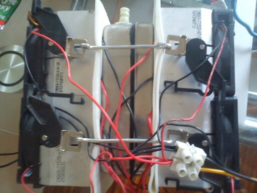 в зеркальности с обеих сторон от контейнера - по 2 модуля Пельтье размером 40х40мм, термоизоляционная пленка, радиаторы охлаждения по одному на каждый модуль, кулер на каждый радиатор.