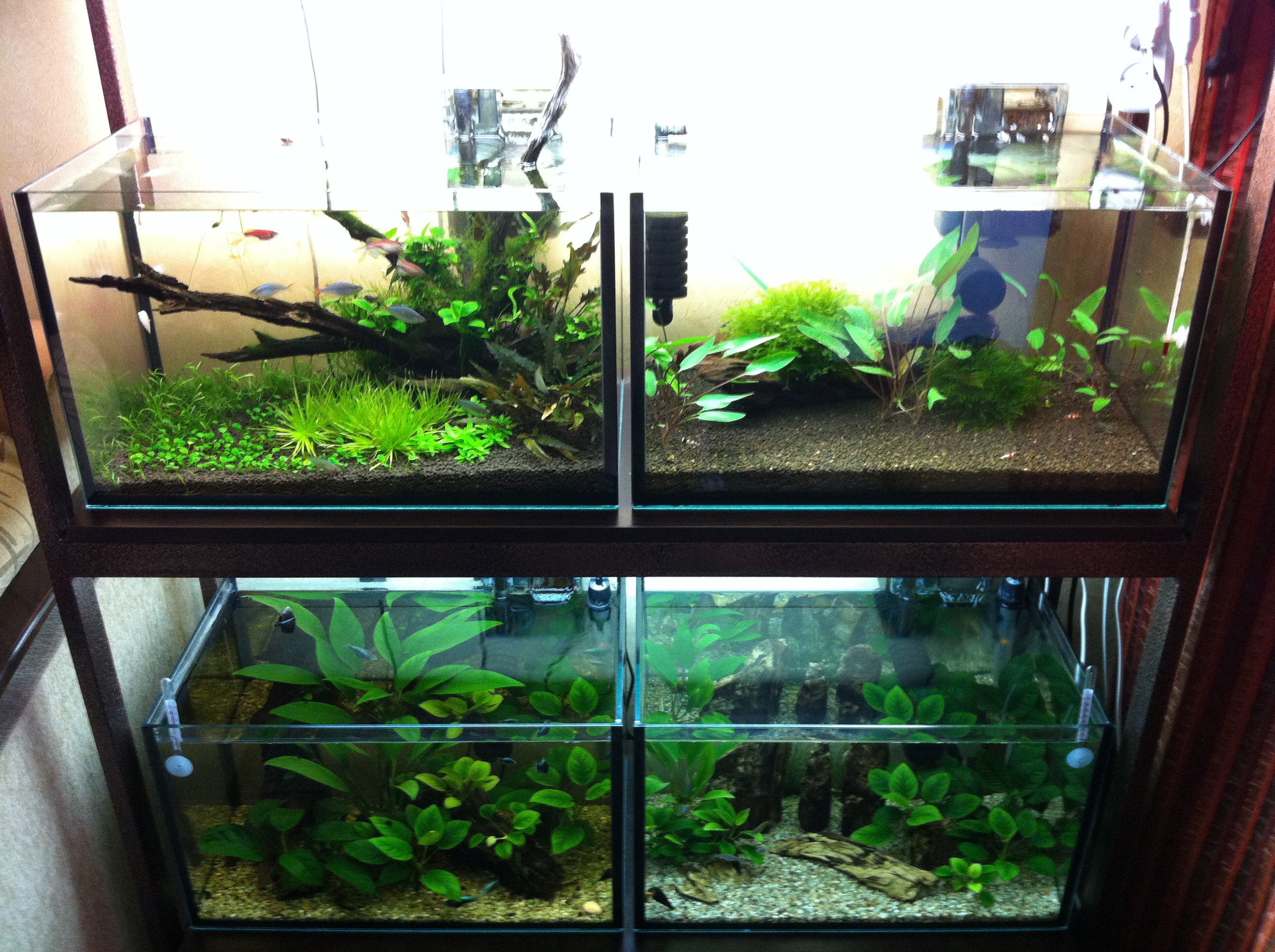 Общий вид двух полок стойки (с описываемым аквариумом в том числе), состояние на сегодня, фото телефоном.