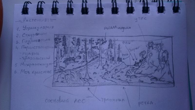 Композиция будет еще сложнее предыдущих скейпов моих ( на фото).Деревья буду делать из сосновых веток,может быть из другого дерева.Справа будет утес до самого верха из камешков,в которых будут деревья торчать.Речку сделаю из песка,а сверху может из синтепона сделаю волны,т.к. речка горная.
