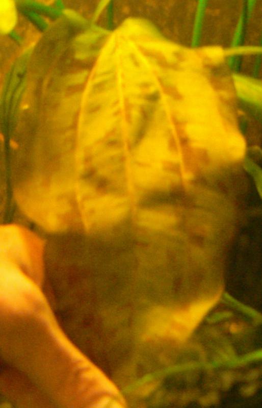 И не жалею. До сих пор присутствуют. Есть еще один - Echinodorus species. Интересно, заказывал ли его еще кто-нибудь. Большой,гад, вырос. Листья на длинных черешках (столб воды 50 см, от грунта в горшке до поверхности чуть больше 35 см), практически до поверхности, размером 20х10 см с характерным крапом. Молодой лист (первый) розового цвета (сфотографировать не удалось), крап более контрастно выражен.