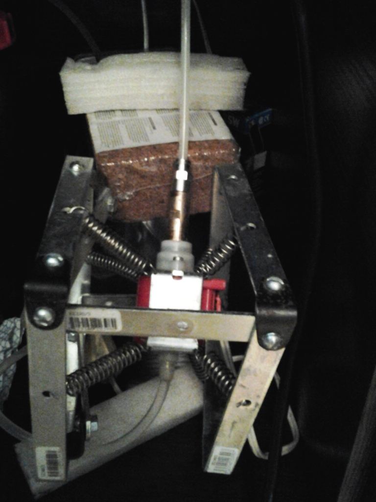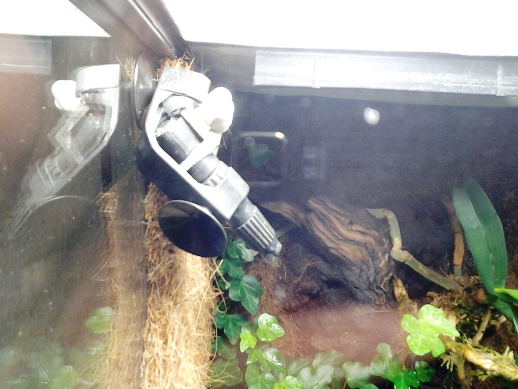 Установка состоит из непрозрачной емкости для хранения воды очищенной на 5л, пластиковой форсуночки от ручного распылителя и помпы УЛКА на 48 Вт. Помпу закрепил на пружинах - дуже громкая:-) Сейчас мудрую с автоматизацией сего процесса (все купил - надо собрать). Думаю еще помпу закрепить на емкости, для экономии места. Стояла система в ЗООЛЮКСЕ на Ахматовой 14, была любезно предоставлена Сашей для развития террариумистики в массах  .