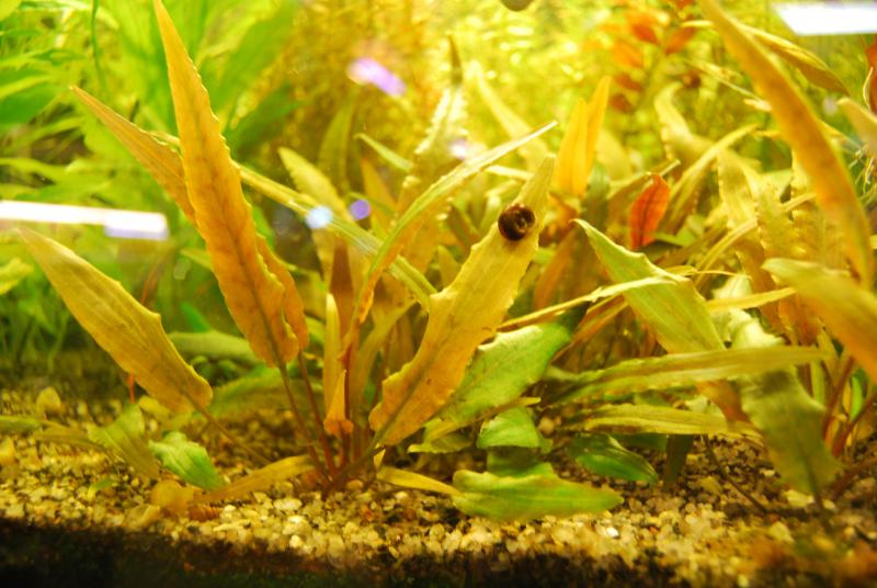 На фото в аквариуме криптокорина Худорои. Это криптокорина из секции апоногетифолия, но у неё листья менее длинные, что делает это растение более привлекательным для содержания в невысоких аквариумах. Эти криптокорины не прихотливые и очень украшают аквариумы,их расцветка зависит от освещения и состава воды. Фотографии с криптокориной Худорои 1 и 3