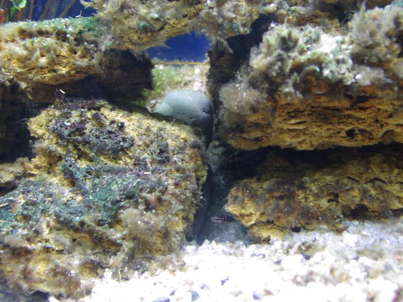 Шестой месяц как живёт аквариум с юлидохромисами, дождался я малька  . Оказалось, что их уже два выводка среди камней. Малька немного, я думаю тут кальвусы помогли, пришлось их переселить. Хотел мальков пересадить, но выловить их просто нереально, по крайней мере я пока не знаю как. Попытался сделать несколько снимков, чтоб не быть голословным  , оказалось не так то просто заснять этих "пещерных" детей, но некоторых получилось