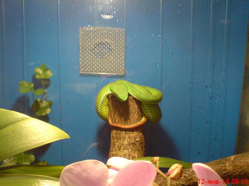 влажность поддерживается за счет опрыскивания дистиллированной водой дважды в день в 12 и 21 час. в 12 часов опрыскиваю и змей вечером только террариум. влажность находится на уровне 75-90%.