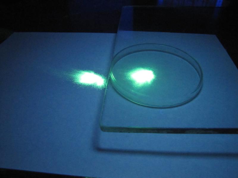 Две кучки одинакового люминофора. Правая накрыта стеклом толщиной 5 мм.