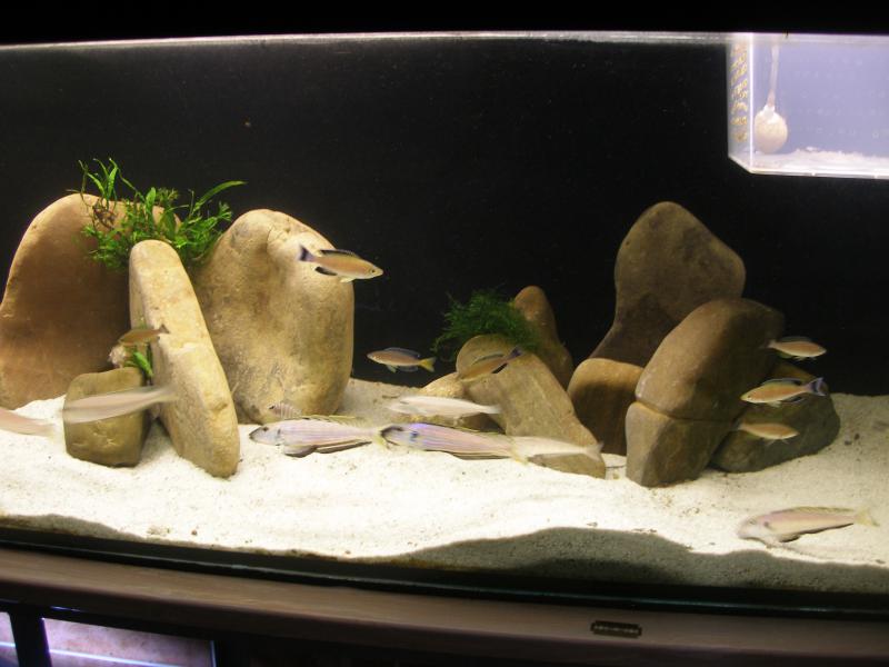 Моё новое приобретение-Telmatochromis vittatus.Хоть и Hendrix писал что этот вид легко найти у нас,но кроме как у него я не увидел больше кто бы содержал этот вид(может плохо искал).Пришлось везти из Москвы.Пока не разбежались по норам успел сразу сделать фото после "загрузки" в аквас из пакетов.