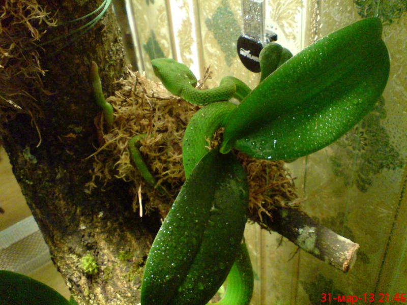 влажность поддерживается за счет опрыскивания дистиллированной водой дважды в день в 12 и 21 час. в 12 часов опрыскиваю и змей вечером только террариум. влажность находится на уровне 75-90%.