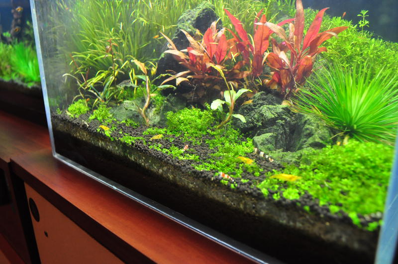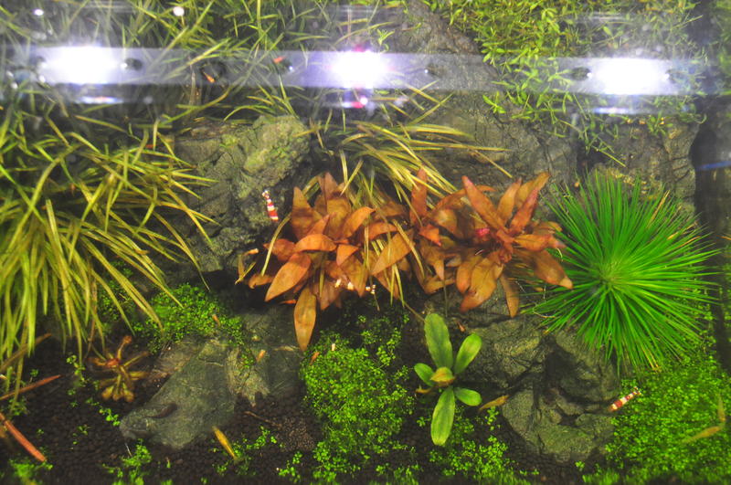 Та ріс Hemianthus micranthemoides в кутку, і там постійно сиділи креветки. Спереду акваріума я їх не бачив. Мабуть світла багато їм. Привикнуть.