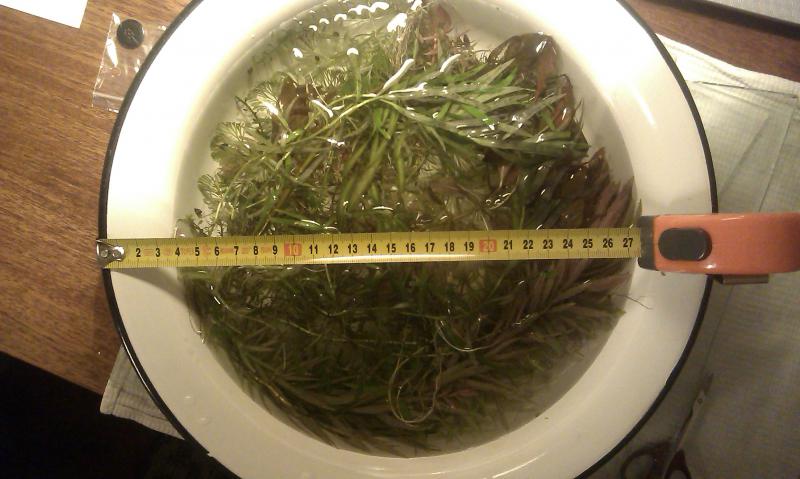 И снова есть растения. В тазике: кабомба коричневая, пару деток криптокорины обычной зеленой, гетерантера остролистная много веток, Амбулия одна, ветка людвигии рубин. Растения в тазу, забрать надо побыстрее...