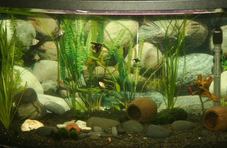 кокос оставить один, развернуть, поставить на задний план. Температуру меряете?, а то про градусник можно с трудом догадаться (справа на фотке). Барбусы скалярок не сьедят, как подрастут могут потрепать плавники, скалярии могут давать здачи.