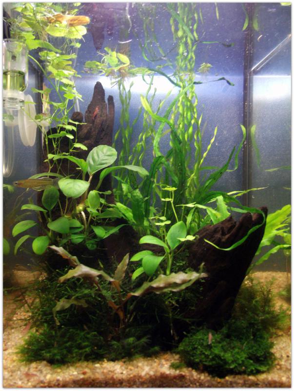 Теперь по существу. После очередного вытягивания фильтра, для фотографирования аквы, прихожу к выводу, что по окончанию конкурса с удовольствием заменю его на навесной фильтр. Ну уж очень много места он занимает в столь маленькой акве, место, которое могли-бы занимать растения.