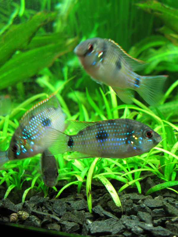 Аномалохромис Томаса. Первый день ребята прятались, а потом все дружно обнаглели, поели всех катушек и общипали всю бороду...ну почти всю. На одной из фотографий видно, как он (она) ее заглатывает. Самое интересное, что продавец (вроде нормальный дядечка) утверждал, что пол рыбок различить почти нереально. А в нете нашла кучу информации по этому поводу. Ну что тут будешь делать - дурят нас, какими бы мы "начитанными" не казались  . Теперь еще хочу приобрести несколько Боливийских бабочек и можно наслаждаться компанией интеллектуалов.