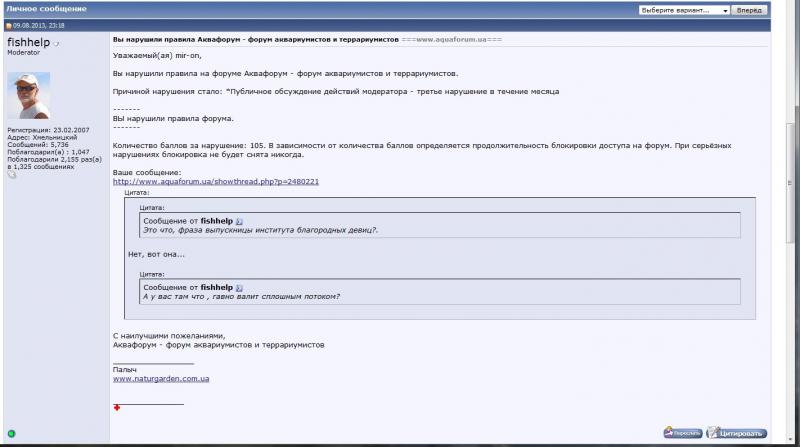 Это в мою сторону??? Показать за что банят? Смотрите первый скрынь. Могу весь диалог привести, если интересно. А причины, по которым удаляют сообщения??? Смотрите второй и третий скрынь. Было еще удалено Димыно сообщение с надписью "а мне так захотелось". Это нормально??? Да гнать такого модератора надо и не только с раздела. Чувак просто решил, что раздел его личный...
