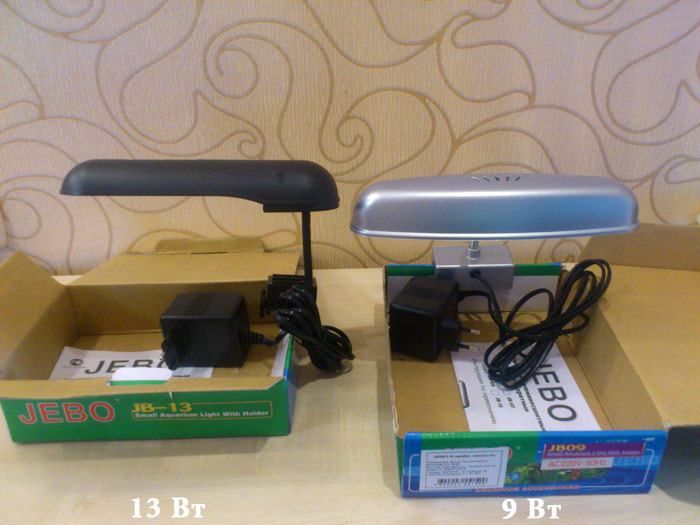 Jebo JB9, JB7, JB13 - компактные люминесцентные мини-светильники для освещения небольших аквариумов. Закрепляется на стенку аквариума с помощью винтового крепления, выполненного из надёжной пластмассы. Гибкий металлический держатель позволяет оптимально направить освещение в нужное вам место. Отправка из Харькова.