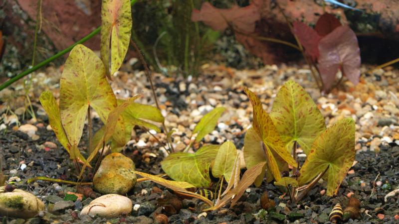Nymphaea sp. "Dwarf" Santarem, родина Бразилия. Редкая и новая в украинской ( и не только ) аквакультуре нимфея. Обладает рядом привлекательных особенностей, делающих этот неопределённый вид очень перспективным, как для акваскейперов, так и для просто любителей аквариумной флоры. Как следует из торгового названия эта нимфея действительно карликовая, листовая пластина вместе с черешком достигает длины 6-8см., с учётом, того, что лист располагается под углом, то реальная высота куста и того меньше. Размножается как валлиснерии или эхинодорус нежненький, столонами, молодые растения формируются одно за другим, при этом растения образуют очень плотные заросли, такие, что не видно грунта. При выращивании в мягкой воде под сильным освещением и полноценном питании скорость роста очень высока. Перечисленные особенности нимфеи-карлика из Сантарена позволяют отнести её в разряд полноценных, т.н. «почвопокровных» растений. Не забывая, что описываемый вид типичный представитель рода, следует упомянуть о плавающих листьях, формируются не часто, они такие же карликовые, как и подводные, даже ещё меньше, благодаря этому обладают некоторой декоративностью и абсолютно не раздражают.