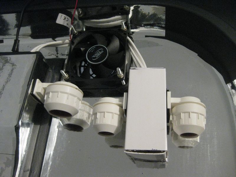 Прочитав множество отзывов о конденсате который стекает с крышки по стеклам было принято решение об интеграции двух кулеров. Так как баночка будет стоять в спальне а кулера должны работать круглосуточно впаял в цепь резистор или транзистор  (я в них напрочь не разбираюсь, попросил кума о помощи) который снизил обороты кулеров до минимума. Снаружи закрыл их декоративными решетками.