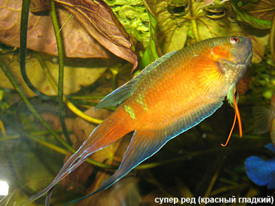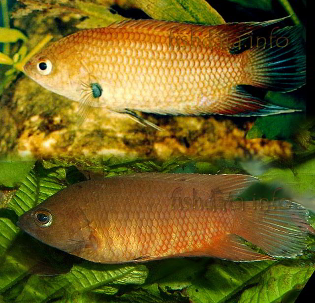 Забарвлення їх досить яскраве, загальний фон голови і тіла червоно -коричневий, спина при переході до спинного плавника коричнево - червона з бронзово червоним відливом, при певному падінні світла в забарвленні проявляється смарагдове забарвлення, черевце трохи більш світле. Насиченість забарвлення залежить від умов утримання і температури води. При зниженні температури води окрас світлішає, а при підвищенні навпаки темніє і стає більш насиченим.