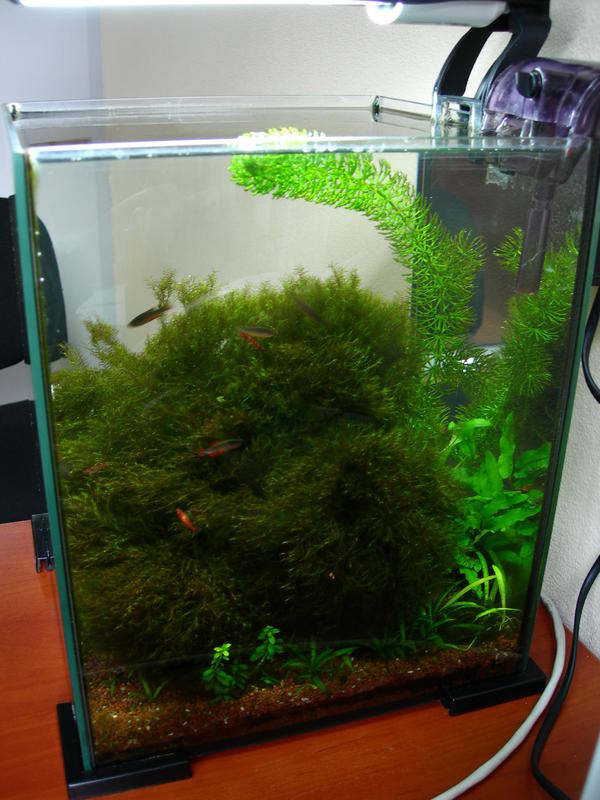 Аквариум на фото объёмом 20 л, то есть мох занимает объём около 10 л.