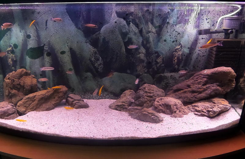 500литров ,Tropheus sp. Red Chimba ,Cyprichromis leptosoma 'jumbo speckleback Moba'. Сдесь тоже беда с освещением , и камней надо добавить . Приму замечания по дезайну .