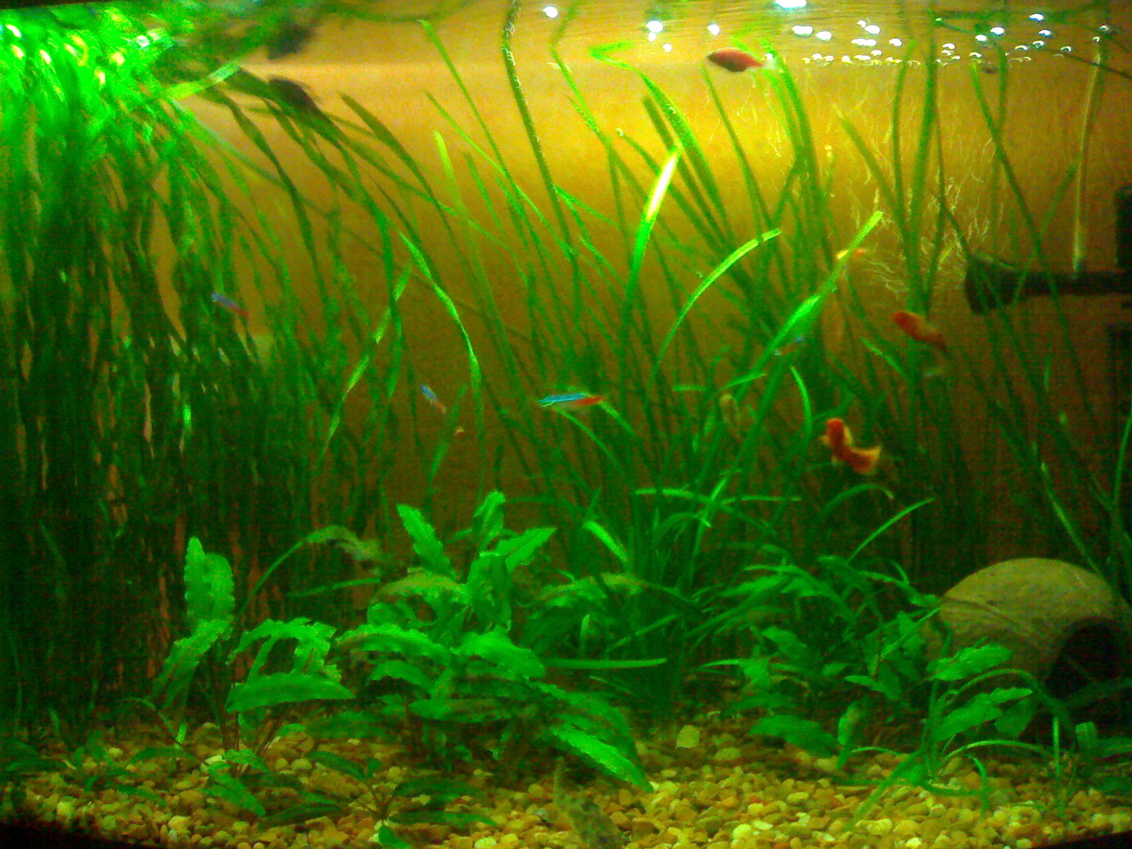 Про коряжку я тож так хочу, но пока нет коряги(в воскресение ездил на птичку ничё нормального не нашол) и домик стоит временно, там прячутся лялиусы от лабео. Если валюху садить "рядком" то она будет под углом 90 из-за потока фильтра который идёт по задней стенке, и за зарослями прячутся апаратура.