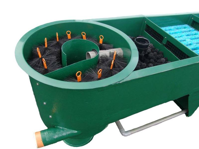 вода из пруда, через ультрофиолет поступала в первую бочку(черного цвета) и входила через сопло, которое создавало вращение. Внизу бочки с плоским дном я боролся так-просто вставил сделанный из пластика конус, и там же внизу конуса выход трубы д63мм через кран. В верхней части бочки-вырезал из маталы круг и вставил. Вода проходя через неё(40мм толщина) дофильтровывалась и затем через гребнеобразную воронку(для насыщения воды воздухом) сливалась в соседнюю бочку, причем с низу. У второй бочки тоже в центре днища выход в каналью через кран. В этой бочке на высоте 20см от днища-решетчатое дно(фальшдно) к которому прикреплен распылитель от аэратора. Засыпал плавающей загрузкой. Фальшдно не дает попадать загрузке в каналью.
