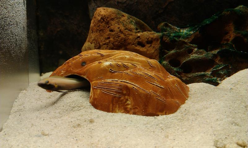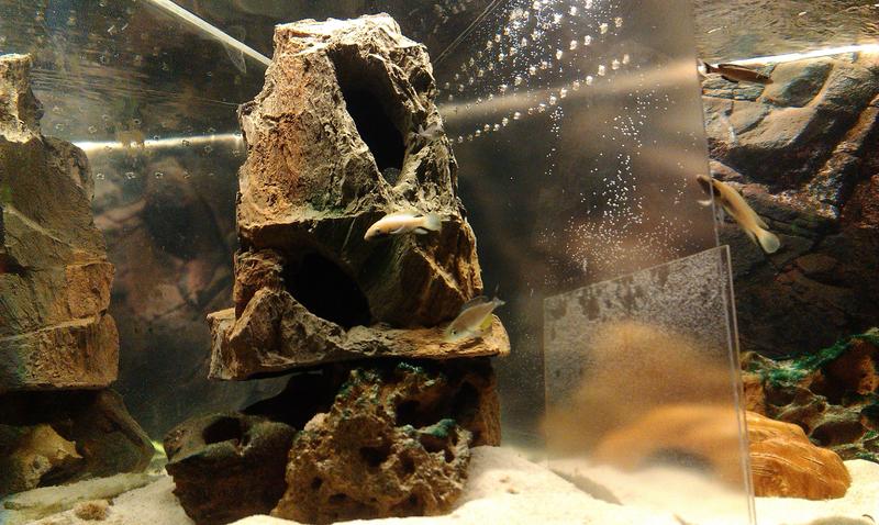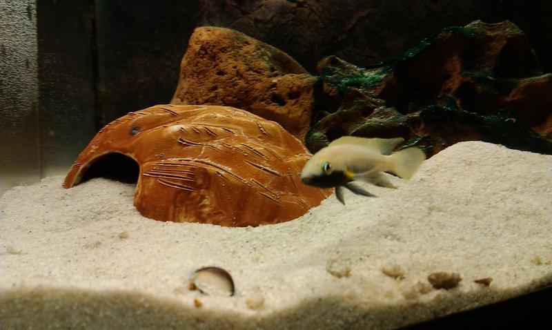 На сегодняшний день аквариум разделён глухой перегородкой,самец и самка видят друг-друга через прозрачное оргстекло.Добавил в аквариум несколько новых декораций с целью увеличения "схованок".