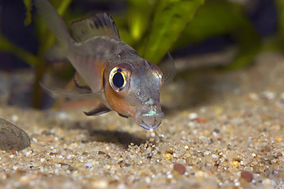 Только написал пост, посмотрел и все увидел. На песке блошки!!! По команде "атас" все ломанулись в рот мамаше. Один не заховался, спрятался на песке так, что не разглядеть. Только подплыла мамка, сразу же ей показался "нырнув"вверх и позволил себя забрать.