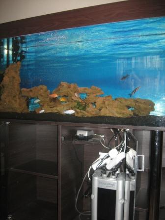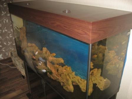 Продам Аквариум 1200х400х550, 8мм, 260 литров, куплен в зоомагазине "Афалина" два горизонтальных ребра одна стяжка + крышка (свитильник Т8 2х30Вт, независимый) + тумба (венге, колоны, танированое стекло) -за все 1800грн
