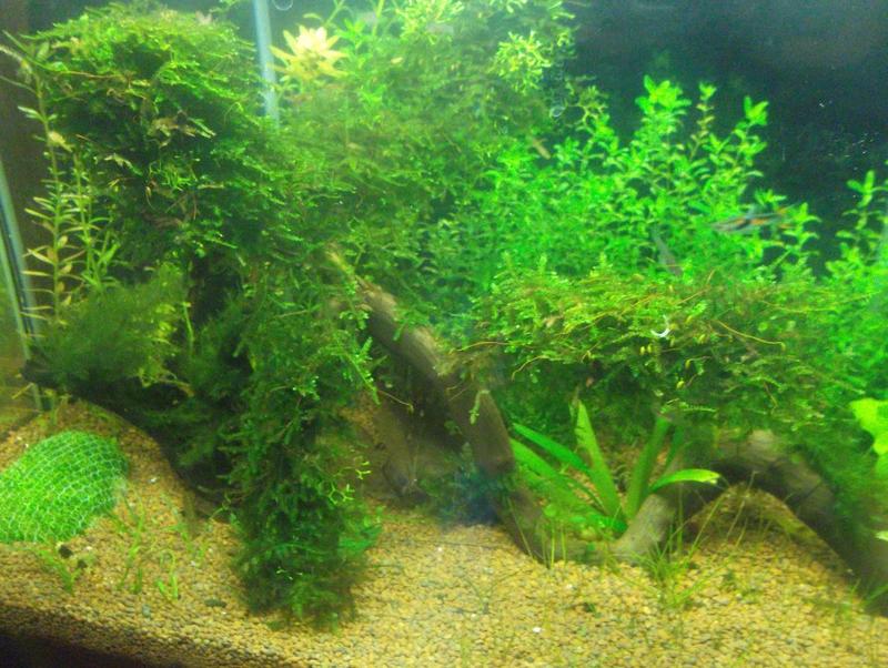 Riccardia chamedryfolia - просто шикарно смотрится на корягах на переднем плане, требует очень много света, поэтому креплю повыше. в наноаквариумах можно ложить намотыши на кокосик прямо на дно - коврик шикарный. Достаточно тяжело содержать.
