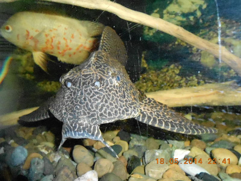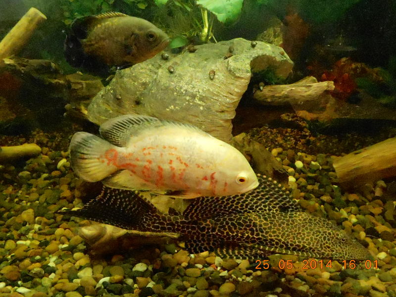 Присутствуют две баночки-маленькая 120 л. и средняя 430 л. В маленькой 5 мальков астронотуса и 2 малька парчового сома. В средней 5 подростков астронотуса и 2 взрослых парчовых. Всех астронотусов брал мальками 3-5 см., 6 азиатов и 4 местного разведения. Кормлю 2 раза в день-утром сухой гаммарус, вечером свеже мороженная килька, с гаммарусом проглатывают ряску. Воду не меняю. Сифоню дно раз в 2-3 недели и подливаю из под крана 20 градусную воду. Фильтры только внутренние-помпа с губкой. Свет-люмминисцентные трубки, горит примерно 12 ч., в средней баночке всю ночь горит трубка на 6 ватт, потому, что астронотусы бьются об стекло. В обоих баночках присутствуют 5 разновидностей анубиаса, астронотусы его не рвут, один зацвел на песчанике. В маленькой баночке корень от живого дерева-ивы. В средней три коряги-корень сухого кустарника ивы, корень сухого тополя, пенек с корнями от живого дерева (название не знаю) и 1 камень песчаник. В грунте живут 2 вида улиток. (фотки не очень, не умею фотографировать)