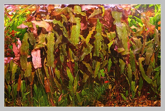 Растет в водопроводе, быстро, верхняя сторона листа сочно оливковая, нижняя нежно розовая.
