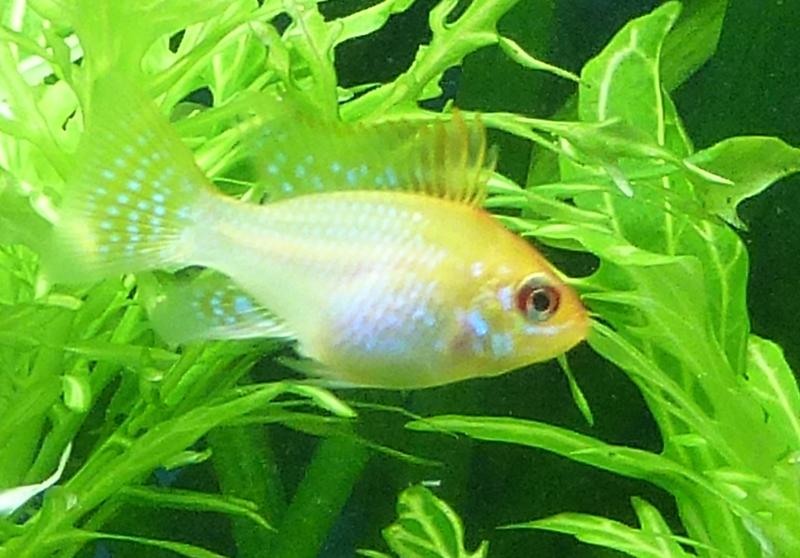 Apistogramma ramirezi "Gold" — окрашена в интенсивно-кирпичный цвет, на котором светятся многочисленные голубые пятнышки. Такими же пятнышками усеяны фиолетовые хвост и анальный плавник. У самца спинной плавник с высокими лучами имеет оранжевый цвет, переходящий в верхней части в ярко-красный. Черные бусинки глаз окружены рубиновым кольцом. У самки тело ровного золотистого цвета.