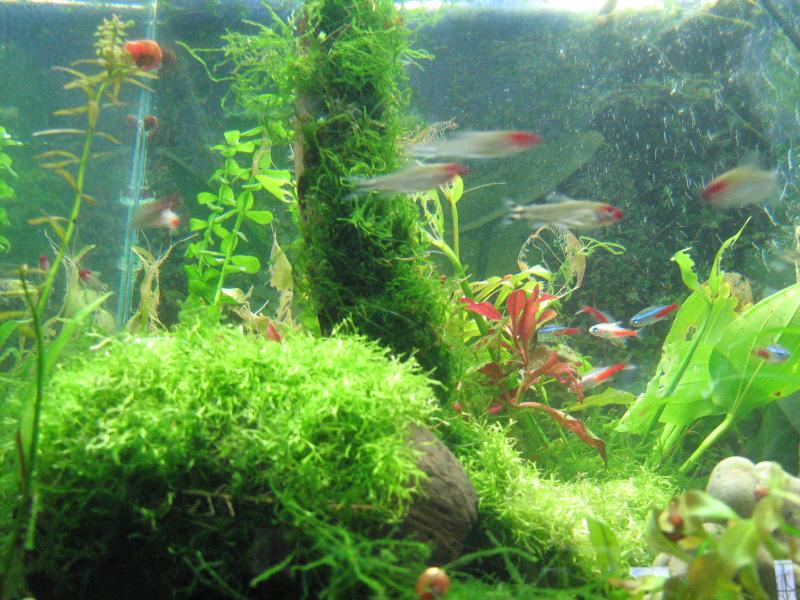 22.05.08 во второй половине дня, чего-то мне захотелось предпринять в отношении к банке, что долгое время квасилась в стерильном состоянии стоя на сейфе, служила в качестве карантинника. И вот, надоело созерцать мёртвую тишину, банку слил, промыл, прожег совдеповской увч лампой, так, долгострой мне был не нужен, банка 48 литров, почти кубик, слил по ведру, около 30 литров с рабочих банок, ведро из-под крана, с водой готовчик, кулёк с грунтом и всякими цацками уже давно пылился на складе, содержимое было промыто и ошпарено кипятком, уложено в предполагаемый шедевр    , растения, в торговых банках надыбал всякого мусора, не имеющего товарного вида, кокос и огрызок коряги спёр из банки с анцитрусами, на новую грелку и фильтр не поскупился, и вот в течение часа початок жизни типа травника был сделан. Из жильцов было отдано предпочтение килли, но они, через час были выселены, а их место заняли: 8-ред черри, 2-апистограммы борелли, 5-золотых неонов, 6-обыкновенных, 7-родостомусов, 2-малька стурисомы панамской, 2-ампулярии (на момент написания, все живы и здоровы аппетит в норме  ), и вот, банка готова, да, свет пока 2х11Вт дневной. Самое смешное, произошло, когда начал фотографировать, даже застеснялся показывать фотки  , но, будем надеяться, что со временем аквариум перерастёт этот казус