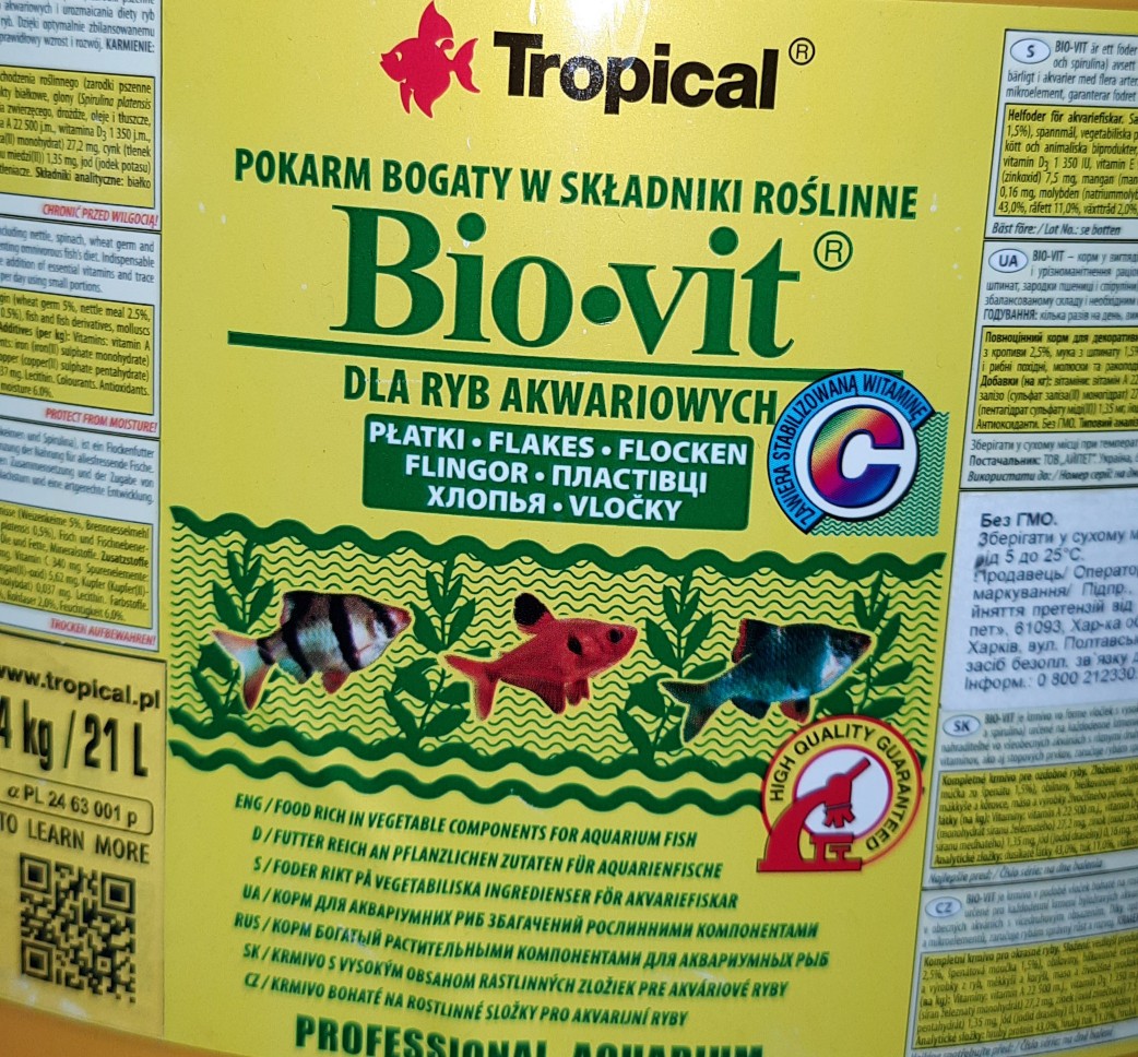 BIO-VIT Основной растительный корм в виде хлопьев. Предназначен для ежедневного кормления растительноядных рыб, а также рекомендуется как дополняющий корм для всеядных рыб. Оптимально сбалансированный состав и соответствующий набор витаминов и микроэлементов обеспечивает правильный рост и развитие рыб, одновременно покрывая их энергетические потребности. Благодаря значительному содержанию балластных веществ довольно длинный, как правило, пищеварительный тракт растительноядных рыб работает правильно, а рыбы регулярно кормленные кормом BIO-VIT не подвергаются запорам и опасным воспалениям пищеварительного тракта.