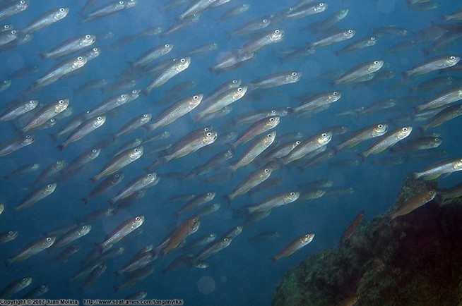 Рис. 7. Колония Cyprichromis leptosoma на 8-ми метровой глубине в Silaf Rocks, Cape Mpimbwe, Танзания. На фото видны цветовые вариации C. leptosoma с оранжево-синей хвостовой частью, а также с желто-синим спинным плавником. Колония объединяет все цветовые вариации, а так же бесцветных самок. Во многих областях вокруг Cape Mpimbwe, иследуемые крупные колонии C. leptosoma по предварительным оценкам насчитывали до 100,000 особей.