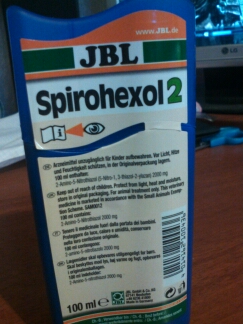 В.1 таблетка на 20 л воды. Требуемое количество таблеток поместить непосредственно в аквариум в зону с хорошей циркуляцией воды. Длительность обработки: 1 неделя. Через 1 неделю поменять воду в аквариуме на 75%. В случае необходимости повторить обработку аналогичным способом. Препарат JBL Spirohexol не применять одновременно с другими лечебными средствами. Если незадолго до обработки препаратом Spirohexol применялись другие препараты, требуется 75-процентная смена воды. Во время обработки воды препаратом JBL Spirohexol не пропускать воду через активированный уголь. На время обработки препаратом JBL Spirohexol отключить ультрафиолетовый стерилизатор. Во время обработки аквариумной воды препаратом JBL Spirohexol обеспечить хорошее снабжение аквариума кислородом.